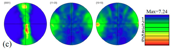 Pole figures of as-extruded Mg-Sn alloys obtained by EBSD (along the extrusion direction): (a) Mg-6Sn; (b) Mg-6Sn-2Zn; and (c) Mg-6Sn-2Zn-1Ca.