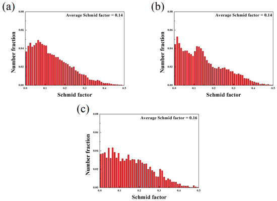 The distribution of Schmid factor of the as-extruded Mg-Sn alloys: (a) Mg-6Sn; (b) Mg-6Sn-2Zn; and (c) Mg-6Sn-2Zn-1Ca.