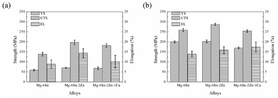 Figure 10 shows the influence of Zn and Ca addition on strength at room temperature of as-cast and as-extruded Mg-Sn alloys. For as-cast samples, yield strength (YS), ultimate tensile strength (UTS), and elongation (EL) of the Mg-6Sn alloy were 59 ± 4 MPa, 138 ± 9 MPa, and 8.9 ± 2.1%, respectively. With the addition of Zn element, YS, UTS, and EL of Mg-6Sn-2Zn alloy were improved to 70 ± 3 MPa, 197 ± 11 MPa, and 14.4 ± 1.7%, respectively. However, further addition of Ca element was harmful to strength at room temperature, and YS, UTS, and EL of Mg-6Sn-2Zn-1Ca alloy were reduced to 68 ± 7 MPa, 182 ± 9 MPa, and 10.2 ± 3.1%, respectively. For the as-extruded samples, strength at room temperature was improved significantly when compared to the as-cast samples. The YS, UTS, and EL of the Mg-Sn alloys were improved by 150.2–239.8%, 39.7–87.6%, and 10.4–70.6%. Similar to the as-cast state, the as-extruded Mg-6Sn-2Zn alloy exhibited the best strength at room temperature with a YS of 202 ± 7 MPa, UTS of 287 ± 5 MPa, and EL of 15.9 ± 1.7%. Though the Mg-6Sn-2Zn-1Ca alloy presented the highest EL of 17.4 ± 2.5%, its YS and UTS were lower than those of the as-extruded Mg-6Sn and Mg-6Sn-2Zn alloys.