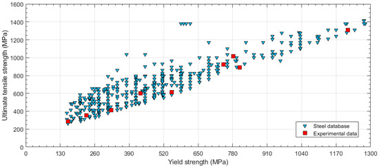 Steel database obtained from the ASME Boiler and Pressure Vessel Code (BPVC)-IIA and experimental data selection (ultimate tensile strength vs. yield strength).
