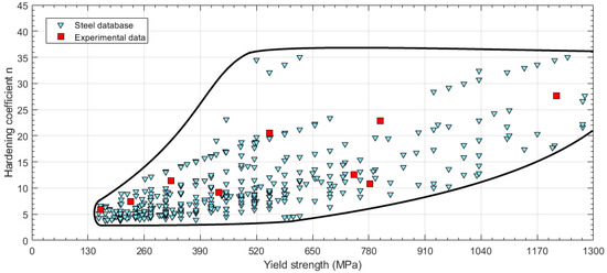 Once the strain hardening coefficient n of the material was obtained from Equation (6), the previous steel database presented in Figure 2 was changed to show the relationship between the hardening coefficient n and the yield strength (see Figure 3). A boundary limit for the steel database is represented in Figure 3. The hardening coefficient n was limited to a minimum value between n = 3 and n = 4, and the upper limit was set to levels of n = 37. The lower limit of n increases with the yield strength, and the same behavior is shown for the upper limit.