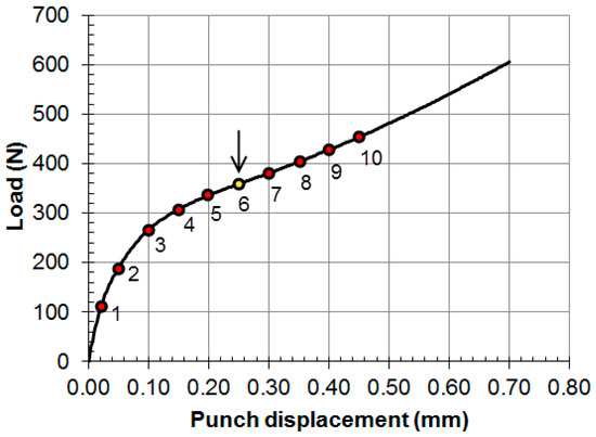 The simplified material model used in this study guaranteed two rigidities: elastic stiffness controlled by the elastic modulus E, and plastic stiffness controlled by the plastic tangent modulus Ep. The SPT curve is a load versus displacement curve that shows the global stiffness of the specimen in its slope. This global stiffness is a combination of two factors: the geometry of the test and the material stiffness distribution. The geometry of the test changes during the test because of changes in the contact surface area between the punch and the upper surface of the specimen. At greater punch displacements, the contact area is greater and the dependence on the geometry of the SPT’s stiffness increases. The material stiffness is obtained as a combination of two rigidities: the elastic stiffness and the plastic stiffness. An increase in the volume percentage of the specimen affected by plastic strain generates a decrease in the global specimen stiffness.