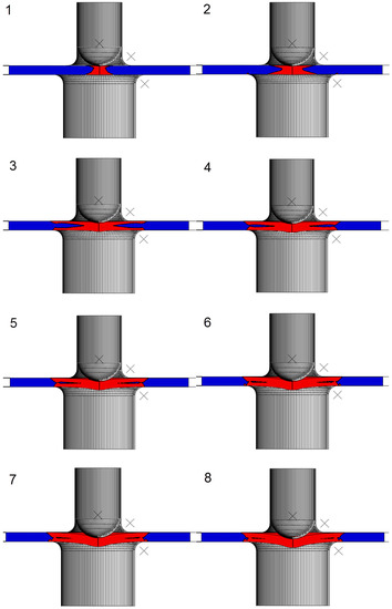 Elastic (blue) and plastic (red) zones in the SPT specimen at positions 1 to 8.