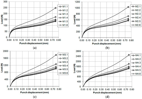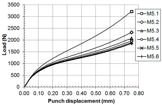 Thirty hypothetical materials, M1.1 to M5.6 (see Table 1 for the mechanical properties of these materials), were simulated with the finite element model used in the previous section. Figure 8 and Figure 9 show the load versus displacement SPT curves for these hypothetical materials.