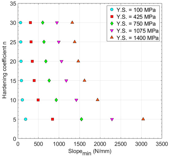 The Slopemin for all of the hypothetical materials is shown in Table 3 and Figure 10, where a dependency of the Slopemin with both the hardening factor n and the yield strength is shown. For each value of yield strength, a correlation following Equation (7) seems to show a good fit. To determine the functions φ1 and φ2 of this equation, the Matlab® Curve Fitting ToolTM [23] was used with the non-linear least squares method.