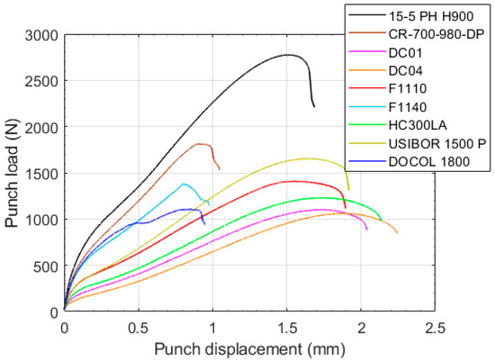 Nine steels—DC01, DC04, HC300LA, F1110, F1140, 15-5PH H900, USIBOR 1500 P, CR-700-980-DP, and DOCOL 1800 CR—were tested using standard tensile tests (ASTM E8M) and SPTs to verify the numerical results previously shown. Table 2 shows the mechanical properties for all of the tested materials, and Figure 14 shows the SPT curves obtained from the experimental tests. The geometry and the setup of the SPTs were the same as the ones analyzed in the previous numerical calculations. These experimental data were partially obtained in a previous study [22].