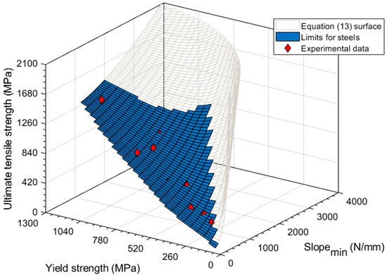 In order to calculate the experimental correlation equation between the ultimate tensile strength and Slopemin, all of the numerical parameters were calculated again with Equation (10). The yield strength used in Equation (10) was the value obtained from the SPT curve via the Slopeini method (Equation (12)) [22].