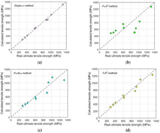 Calculated vs. real ultimate tensile strength of the experimental tests: (a) Slopemin method, (b) Pm/t2 method (c) Pm/tum method (d) Fi/t2 method.