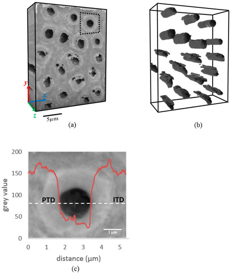 The 3D rendering of the spatial distribution of PTD and ITD is displayed in Figure 1a by reconstructing a sequence of BSE images obtained by sequential FIB millings. The overall reconstructed volume is 16.92 × 21.6 × 7.2 µm3 and dentinal tubules are also displayed in Figure 1b. The tubules are seen to have an overall shape of approximately circular cylinders that run parallel with each other, having a mean cross-sectional diameter of ~1.6 µm and mean spacing of ~5 µm. The features associated with a single tubule (highlighted by the black dashed square in Figure 1a) were further explored in detail to reveal the variation of the grey value (intensity) across PTD, ITD, and within the tubules. The mean grey value varies from the value ~152 in the ITD to ~160 in the PTD, and drops down to ~44 upon reaching the hollow tubules (see Figure 1c).