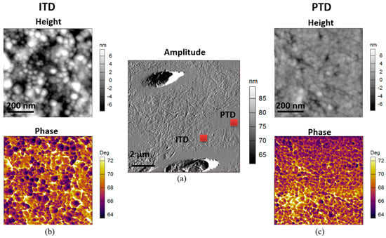 Tapping mode AFM induces small range probe tip oscillation that changes in amplitude and phase not only depending on the sample surface topography, but also on the properties and the mode of interaction with the sample material. High resolution topography (height image), amplitude image, and phase image were obtained using a commercial AFM instrument (MFP-3 D, Asylum Research, Oxford Instruments, High Wycombe, UK). Amplitude image reveals morphological details and phase image is used to identity regions with different material phases (composition, elasticity or others). A large area (10 × 10 µm2) was mapped initially to identify PTD and ITD regions at the sample surface. This was followed by detailed height and phase mapping (3 × 3 nm2 pixel size) both for PTD and ITD regions, with the scan areas of 700 × 700 nm2.