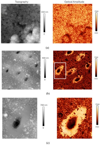 In Figure 3a–c, s-SNOM mapping results are shown in two columns representing topography (height) and optical amplitude, respectively. Figure 3a shows the images of a 5 × 5 µm2 region of ITD. The grain structure is revealed particularly clearly in the optical amplitude image, illustrating the potential of this approach for the study of human dental tissues and bone. Figure 3b shows a large area (20 × 20 µm2) scan of a region containing multiple dentinal tubules. The particles present at the surface of ITD may be related to sample preparation artefact, and reveal the larger volume fraction of “organic glue” in ITD compared with PTD. Figure 3c shows a zoomed in image (6 × 7 µm2, indicated in (b)) of the area around an individual tubule that emerges at the surface obliquely. An “avocado-shaped” region of PTD is particularly clearly revealed in the optical amplitude image. The smoother surface appearance of PTD in Figure 3c is indicative of the very fine-grained structure of this region.