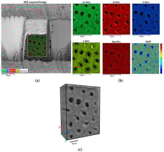 In addition to the above mapping, 2D analytical SEM-EDS was performed on the front surface over a smaller 15 × 15 µm2 region of interest (ROI) of FIB milled trench using Oxford Instruments (High Wycombe, UK) X-Max 150 EDS detection system. The elemental distribution maps of Ca, O, P, C, and Mg were obtained from the ROI with the pixel resolution of 55 nm in both x- and y-directions, allowing the weight percentage of individual elements to be determined from the analysis of the EDS spectra.