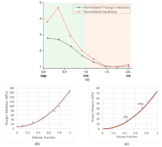Young’s modulus and hardness of PTD and ITD. (a) The values from Ziskind et al. [22] in y-axis were normalized with respect to the ITD values. The horizontal axis represents normalized position, so that 0 and 1 on the x-axis correspond to the edge of the tubule and the boundary of PTD with ITD, respectively. The region of PTD on the left and ITD on the right are highlighted in different backgrounds. (b) Young’s modulus of a particle-reinforced composite calculated using FEM (Finite Element Method) by Fritzen and Boehlke [20] that reveals the steep (faster than the Voigt linear rule-of-mixtures) rise in stiffness with volume fraction. The parabolic fit (in red line) to the data points (in blue dots) shown by the curve is introduced in the present study, and discussed in the text. (c) The parabolic description of the stiffness-volume fraction dependence applied to ITD and PTD values shown by the markers.