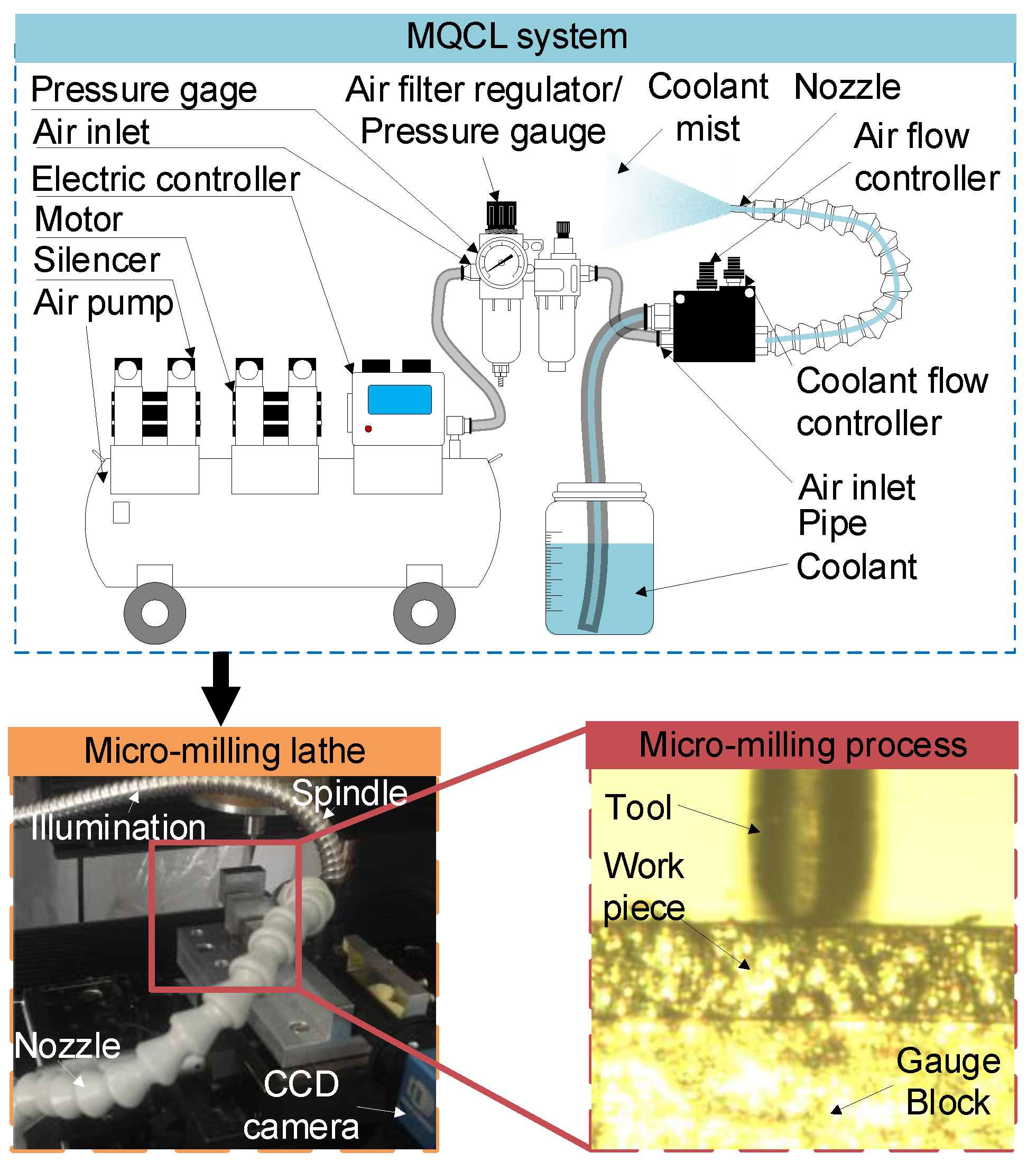 - Li, K.M.; Chou, S.Y. Experimental evaluation of minimum quantity lubrication in near micromilling. J. Mater. Process. Technol. 2010, 210, 2163–2170. [Google Scholar] [CrossRef]