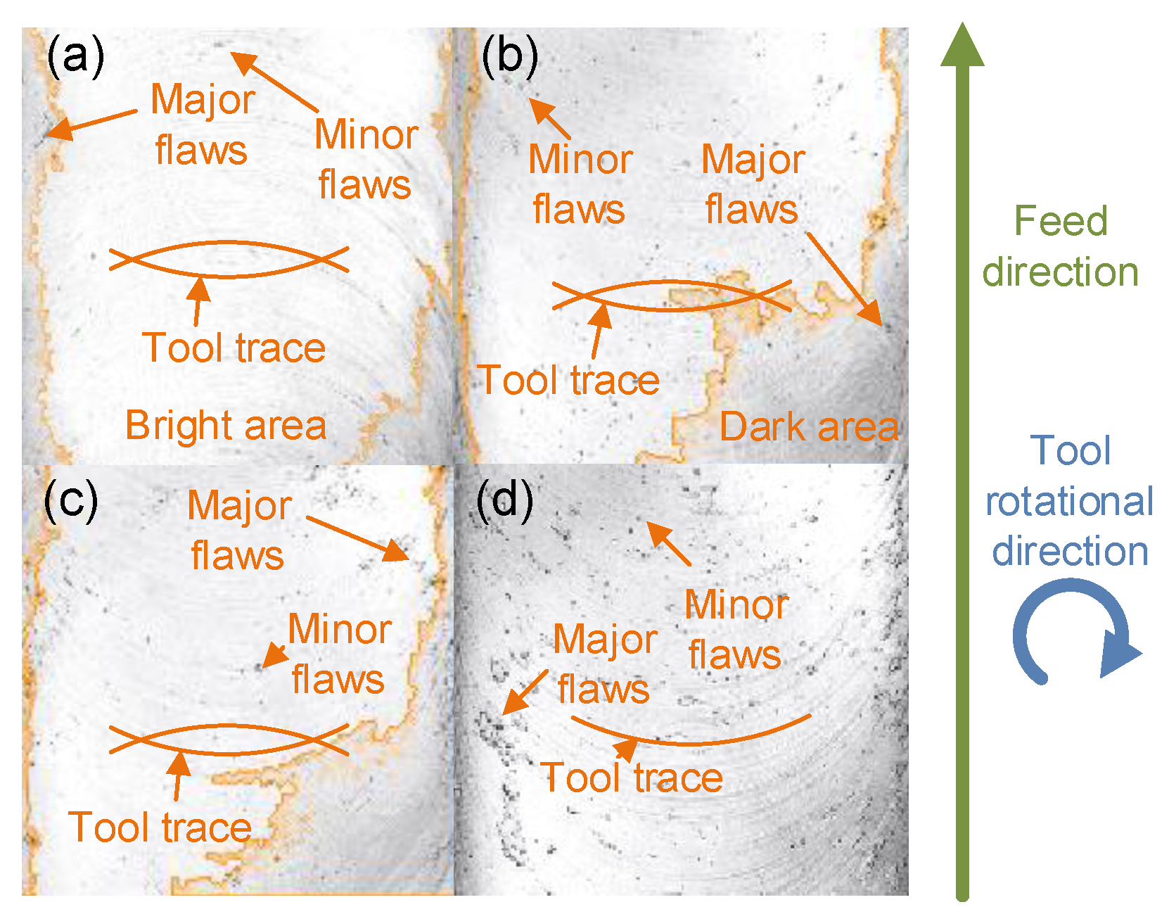 - In the dry-machining case, minor and major flaws on the surface are much more than those in MQCL cases. Even though MQCL has good performance on decreasing probability of BUE formation and improving surface quality, it cannot totally eliminate tool traces on the machined surface.