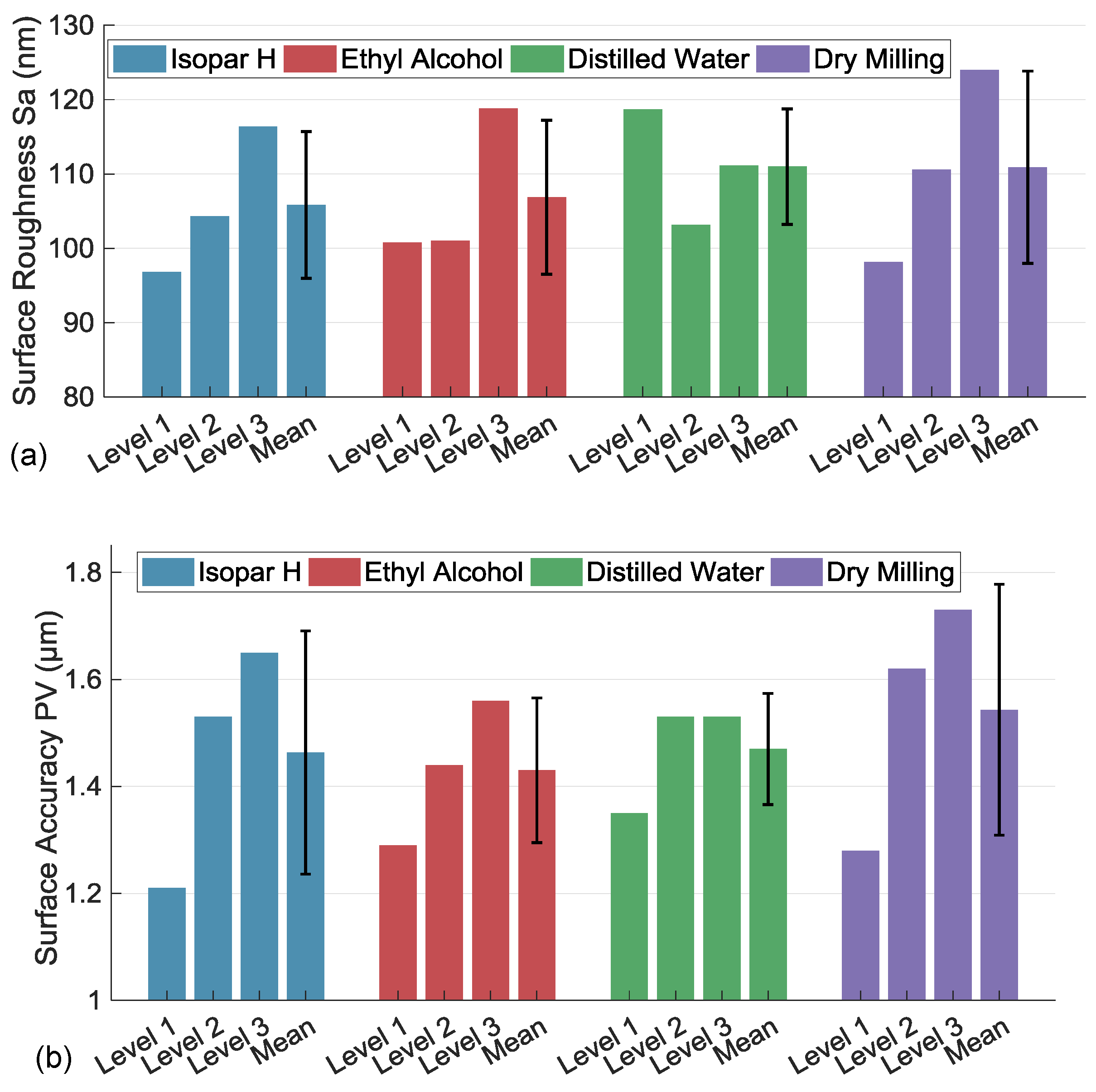 - Surface roughness in MQCL cases is decreased by a maximum of 10.4%, compared with that in dry-machining cases. The best surface roughness is generated in the Isopar H case, but the best surface accuracy appears in the ethyl alcohol case.