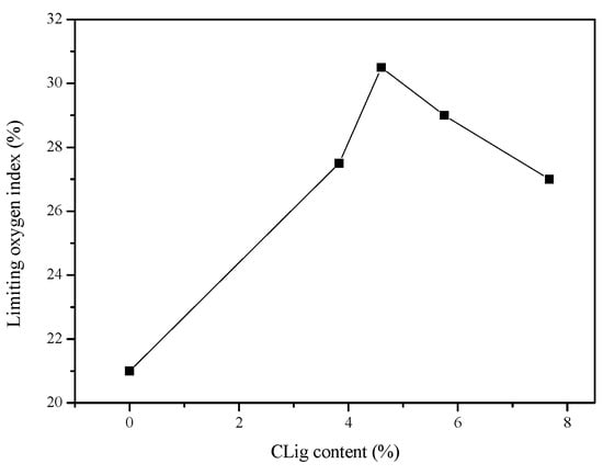 Figure 3 shows the effects of Clig content on the LOI values of PLA/IFR composites with 23 wt% total loading of APP and CLig. It can be seen that the introduction of IFR significantly enhances flame retardant property of the PLA composites. With the increase of CLig content, the LOI values increase firstly, and reach the maximum value 30.5% at the 4.6% of CLig content. However, when the content of CLig was beyond 4.6%, the LOI value decreased. This could be attributed to the unmatched IFR system in which there is a suitable weight ratio among its three components to reach the optimum flame retardancy for materials. Table 1 also shows the flame retardancy of PLA containing APP and unmodified lignin (Lig). It revealed that the flame retardant properties of PLA/APP/Lig dramatically declines. This indicates that APP and CLig show much better synergistic effect on enhancing the flame retardancy of PLA than APP and Lig.