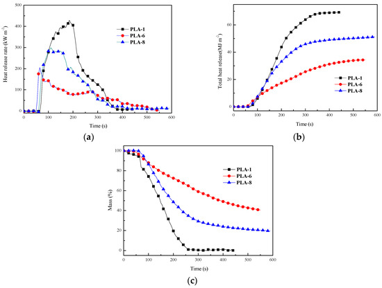 (a) HRR curves; (b) THR curves; (c) MLR curves of PLA and PLA composites.