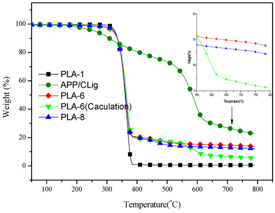 TG curves of pure PLA and flame retardant PLA composites under N2 atmosphere are illustrated in Figure 5 and the analysis data are shown in Table 5. Pure PLA (PLA-1) started to decompose at around 327 °C, and has few residues above 400 °C. Incorporation of flame retardant has no obvious affect on the initial thermal degradation temperature (T5%) of PLA although the T5% shifts to a little lower temperature [30], while the residues significantly increase. Besides, for PLA-6, the residual char at high temperature is higher than that of PLA-8. This could be inferred that the existence of silicon and nitrogen elements in lignin enhances the thermal stability of flame retardant PLA at high temperature. In order to further confirm the synergistic effect between APP and CLig in PLA-6, thermal stability of APP/CLig with 4:1 weight ratio is also investigated.