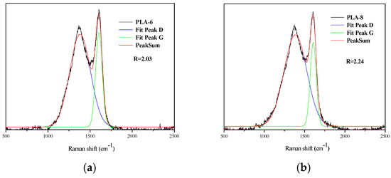 Raman spectroscopy analysis curves of char residue for PLA composites: (a) PLA-6 and (b) PLA-8.