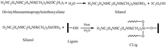 Modification of lignin by γ-divinyl-3-aminopropyltriethoxysilane (Shanghai Beihe Chemicals Company, Shanghai, China) (B201) was carried out as follows: 0.5000 g B201 was dissolved into 50 mL water-ethanol (Sinapharm Chemical Reagent Co., Ltd., Shanghai, China) mixture (volume ratio of water and ethanol with 5/95) to make the B201 solutions. The solution was slowly transferred into 10 g dried lignin powder accompanied with continuous stirring. Finally, the crude product was dried at 105 °C under electric heat oven (Shanghai Huitai Instrument Manufacturing Co., Ltd., Shanghai, China) for 12 h to obtain the modified lignin (CLig). The schematic route for the reaction between silane coupling agent B201 and lignin was shown in Scheme 1.