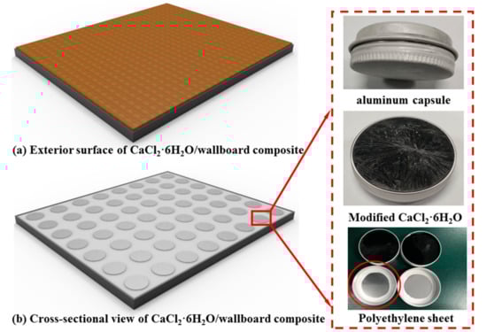 The aluminum capsules containing modified CaCl2·6H2O were used to form modified CaCl2·6H2O/wallboard composite with a dimension of 650 mm × 550 mm × 30 mm. Each modified CaCl2·6H2O/woodboard composite consists of three layers as shown in Figure 1a,b. The bottom layer is a thin metal board with a thickness of 4 mm. The metal board was used to resist the gravity of above layers. The layer in middle was a polyethylene sheet (thickness: 21 mm) embedded regularly with 56 aluminum containers wrapped with PP package. Glass glue was used to fill the gap between the capsules and polyethylene layer for better compactness and to avoid unwanted heat transition. The top layer is a thin woodboard with a thickness of 5 mm. A control wallboard without the modified CaCl2·6H2O was used for comparison.