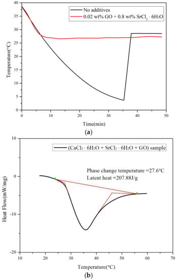 Recently, due to the rapid development of nanomaterials, some nanomaterials can be used as nucleating agents to stimulate the crystallization of inorganic PCMs and some of them can certainly change the properties of PCMs [4,6]. For instance, some researchers [7,8,9] found that adding graphene (0.02 wt %) could reduce the supercooling degree of pure water. On other studies, Li et al. [10,11] confirmed that SrCl2·6H2O could reduce the supercooling of inorganic PCM. Therefore, it has been suggested that the usage of graphene oxide (GO) can be greatly reduced with the presence of SrCl2·6H2O to have the effect on supercooling reduction. Furthermore, the thermal performance of PCMs can be enhanced due to high thermal conductivity of GO.