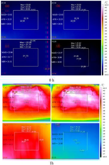 To provide better and distinctive observation of surface temperatures, infrared thermography technique was used to record the temperature variation and heat distribution of the top and bottom surfaces of wallboards after a prolonged heating time. In order to eradicate the environmental impact to the bottom surface temperature, a special room model made of polyethylene was used, as shown in Figure 2. The CaCl2·6H2O /woodboard was used as roof panel on the room model with a dimension of 650 mm × 550 mm × 550 mm. The room models, except the roof, were all made of polyethylene (thickness: 45 mm). One of the two infrared cameras (Ti450, Fluke, Seattle, WA, USA) was installed at the bottom of room model and responsible for recording the internal (bottom) surface temperature of composite woodboard. Another camera was used to record the external (top) surface temperature at the same time. The heat lamp was placed one meter above the room model and operated for 7 h.