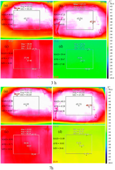 Figure 6 display the top and bottom surface temperature distribution of the control and modified CaCl2·6H2O /wallboard composites, respectively. Table 1 shows the average temperature of two kinds of wallboard. The infrared thermography results show that the bottom surface of control wallboard got heated up quickly due to the direct heat transition from top to the bottom. However, the modified CaCl2·6H2O/wallboard composite successfully prevented the rapid heat transition from the top wooden board to the bottom metal board, thanks to the high latent heat capacity of modified CaCl2·6H2O. After heating for 1 h, the highest average temperature difference between the top and bottom surfaces of control wallboard was around 4.9 °C. In contrast, the average temperature difference in case of modified CaCl2·6H2O/wallboard composite was 15.8 °C. After 3 and 7 h continuous heating, the function of modified CaCl2·6H2O layer in wallboard still remained effective and the temperature difference between the top and bottom layers were maintained at around 14.6 °C and 14.4 °C, respectively. Compared with the control wallboard, the modified CaCl2·6H2O/wallboard composite showed its strong resistance to transfer of excessive heat from top surface to the bottom surface and demonstrated a great potential for use in building envelope to regulate indoor temperature. After 7 h of prolonged heating, the bottom surface temperature of modified CaCl2·6H2O/wallboard composite exceeded the melting temperature of PCM (27.6 °C) which represented its capacity loss for energy, and 7 h working time is deemed as the effective service time of modified CaCl2·6H2O.