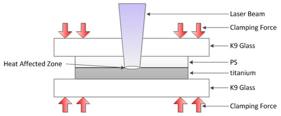 For the laser transmission joining experiment, the PS sample was used as the upper transparent material, and the thin titanium was the lower material. The titanium surface was selected as the laser absorber. Figure 2 presents a schematic of laser transmission joining between PS and titanium. The experiment was performed in the form of the lap joint, using the K9 glass as the clamping layer, and a certain clamping pressure of 0.5 MPa was applied. The process parameters and limits for laser joining are shown in Table 3. Three replicates were performed for each test condition.