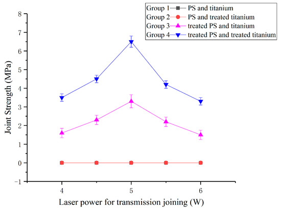 This paper includes four groups of contrasting experiments: The first group consists of PS and titanium; the second group consists of PS and laser-oxidized titanium; the third group consists of oxygen plasma-treated PS and titanium; and the fourth group consists of oxygen plasma-treated PS and laser-oxidized titanium. The experimental result of each combination is shown in Figure 3. From the graph, the joint strengths of the first and second groups are 0 MPa, the maximum joint strength of the third group is approximately 3 MPa, and the maximum joint strength of the fourth group is 6.5 MPa.