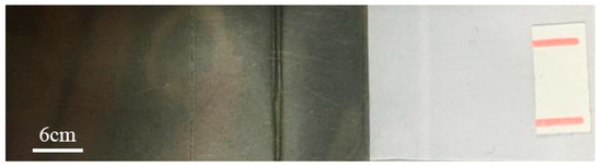 PS without oxygen plasma treatment cannot be joined with titanium. However, oxygen plasma-treated PS achieves joining with titanium under the same process parameters. In addition, the maximum joint strength of oxidized titanium and treated PS is approximately two times that of unoxidized titanium and treated PS. Therefore, oxygen plasma-treated PS is a necessary condition to accomplish the joining, and the use of laser-oxidized titanium can improve the joint strength. Figure 4 shows the sample of transmission joining between an oxygen plasma-treated PS and a laser-oxidized titanium plate.