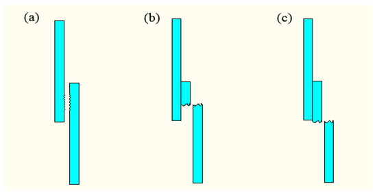 Tensile failure modes. (a) Interface failure; (b) The base fracture along the joint; (c) The base fracture in the middle.
