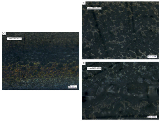 Micromorphology of the joints by laser power for transmission joining. (a) 4 W; (b) 5 W; (c) 6 W.