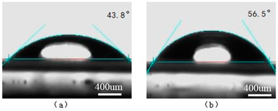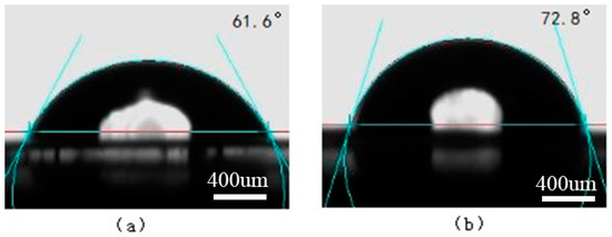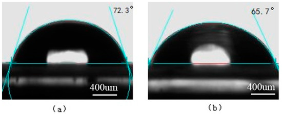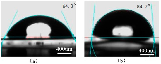 The surface contact angles on the laser-treated Ti surface. (a) Water; (b) Ethylene glycol.