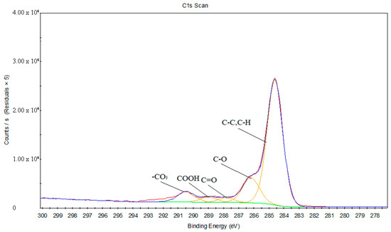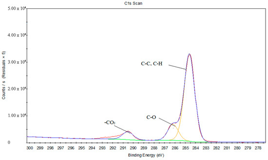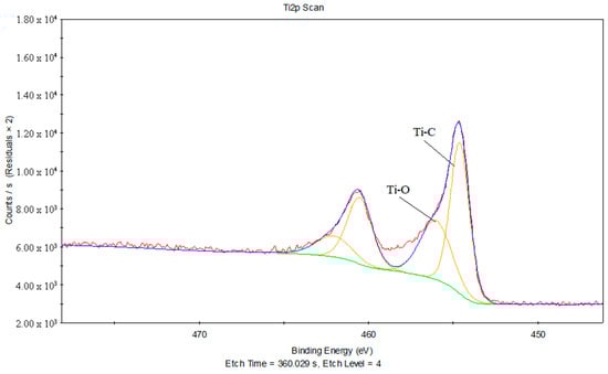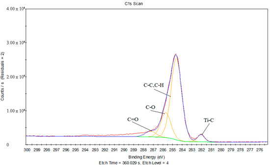 Figure 17 provides the C1s peak fits of the joint between the treated PS and laser-oxidized titanium, and Table 8 gives the chemical bonds information corresponding to the C1s peak fits of the joint between the treated PS and laser-oxidized titanium. It can be inferred that the peaks are 282.05 eV, which is close to 281.7 eV, and is likely the Ti–C chemical bond. Due to the combination of C–C and C–H contributions, a peak at 284.6 eV is generated. Furthermore, the peaks at 285.69 eV and 287.25 eV correspond to C–O and C=O, respectively.