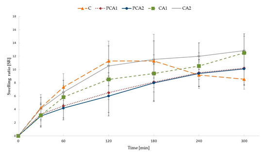 The swelling behavior of designed microparticles was examined in an acidic environment and presented as the swelling ratio (SR), see Figure 3. At an acidic pH, ALG carboxylate groups on the surface of the microparticles are protonated, and water-insoluble alginic acid is formed, which impedes the penetration of fluid into the deeper layers of the particle matrix [48,49]. After contact with this medium, non-modified ALG microparticles take up the fluid, which penetrates into the matrix and leads to an increase of SR to 180 min. Formation of insoluble alginic acid leads to a limitation of swelling, and even shrinkage of particles, which was observed as a decreased SR of formulation C at 240 min. CaCl2 cross-linked microparticles exhibited lower SR values than non-modified formulation C, and a linear increase up to 300 min was observed. The lower amount of swelling in cross-linked microparticles is the result of insoluble calcium alginate formation upon contact with the acidic medium, which leads to a lower water inflow into the matrix [48,49,50]. It was also found that microparticles CA1 and CA2 possessed higher values of SR, compared to the placebo formulations (PCA1 and PCA2), which is due to the occurrence of freely soluble molecules of MF and a faster influx of the aqueous medium into the microparticle structure.