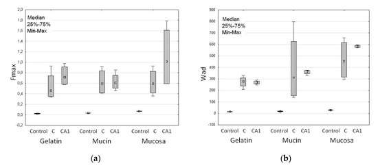 Mucoadhesive features: (a) Maximum detachment force (Fmax) and (b) work of adhesion (Wad) of non-modified formulation C, cross-linked formulation CA1 and cellulose paper (Control) (median; n = 6).