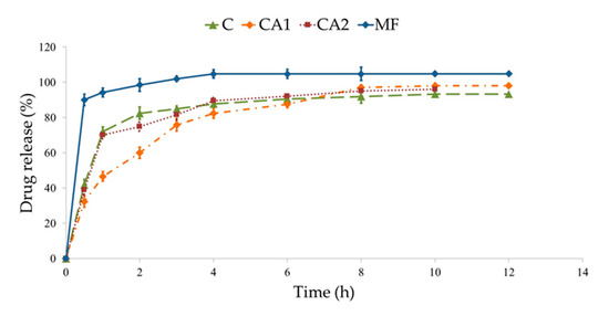 Dissolution of the active substance from microparticles depends on the drug’s water solubility, influx of the medium into the structure of the dosage form, and polymer swelling [49,50]. In drug dissolution from all microparticles, a burst effect, caused by rapid dissolution of freely soluble MF bound at the microparticle surface, was noted and can be seen in Figure 5. Additionally, it was observed that MF was released faster from non-modified microparticles C (82.5 ± 3.6% MF was released after 2 h). This fact is related to the higher SR properties of the unmodified polymer in an acidic environment, which expedites the influx of the aqueous medium into the matrix. Modification of the ALG structure by CaCl2 affected MF dissolution—the release behavior from formulation CA2 (obtained with 0.05% of CaCl2) was comparable to non-modified microparticles C, but formulation CA1 (with 0.1% of CaCl2) significantly prolonged MF release. It was shown that in formulation CA1 60.1 ± 3.8%, MF was released in the first 2 h and sustained to 12 h, whereby it reached 97.5 ± 2.7%. Ca2+ cross-linking leads to a more stable and more intact structure, improves the mechanical resistance of the polymeric network, and reduces its swelling ability [61].