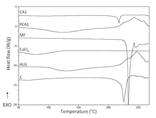 Differential scanning calorimetry (DSC) curves of pure sodium alginate (ALG), metformin (MF), CaCl2, non-modified microparticles C, microparticles PCA1, and CA1.