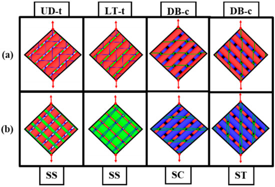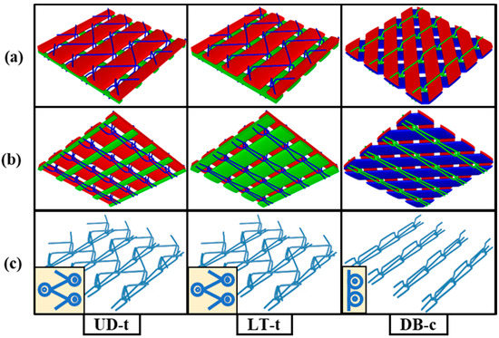 The naming system abbreviations used by the manufacturing company for these fabrics are as following: UD denotes unidirectional, L denotes the longitudinal orientation of the fabric (0°), which is the machine production direction, T stands for the transverse orientation (90°) or cross-machine direction, and DB denotes the double-bias where the yarns are at a specific angle from the machine production direction, which is mainly (+45°/−45°). According to this naming system, the codes UD, LT, and DB become clear. The small letter “t” stands for tricot stitching, and “c” stands for chain stitching; these were added to the original name of the fabric for easily distinguishing the stitching type associated with each fabric. Moreover, all of the other fabric details are listed in Table 1. The fabrics’ 3D geometry was modeled by TexGen software (textile geometric modeler, TexGen 3.5.0) [31]. Both sides and the stitching patterns are shown in Figure 2.