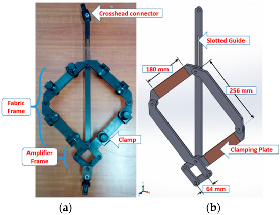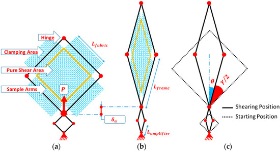 From the illustrations in Figure 4, when the amplifier frame is deformed from the starting position by δa displacement due to applying the tensile force , the fabric frame is deformed by αδa, where α is the device amplification factor; it can be calculated by the following equation: