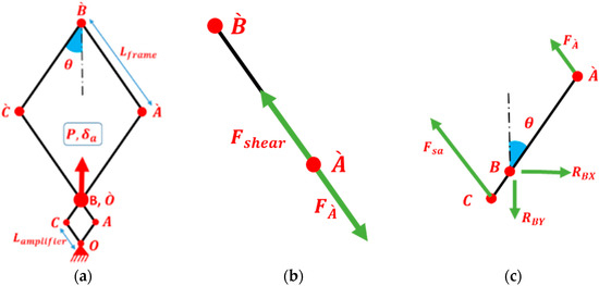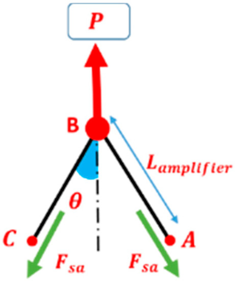 where is the moment at point B, is the length of link , is the shear force applied on the amplifier frame from the tensile machine, and θ is the angle between link to the vertical direction.