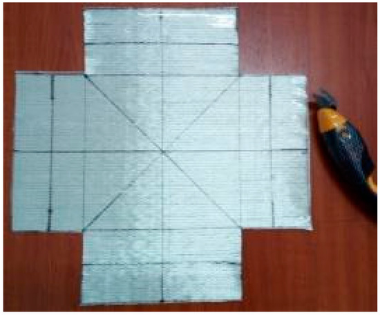 In the beginning, a piece of fabric was cut from the roll carefully, and the marking lines were drawn by a metallic ink marker pen (suitable for glass fibers). The cutting of samples was done by “electric scissor” (shown in Figure 8) to ease the cutting process, prevent the normal problems of using ordinary scissors, such as fiber slippage and local pull-out, and consequently reduce preparation misalignments and increase test reproducibility.