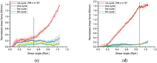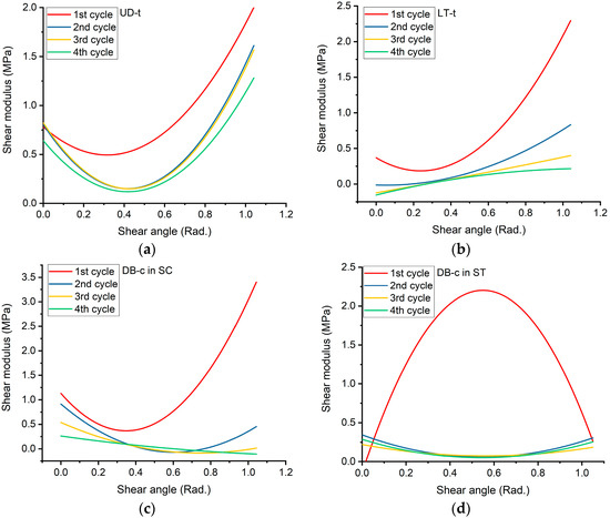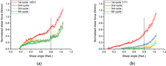 Figure 9a presented the curves of the normalized shear force (expressed in units of N/mm) against the shear angle (in radian) for UD-t fabric. The chart of the first shear cycle showed the same trend as the next shearing cycles, which means that there was no evidence of fiber tension inside the frame; thereby, zero pre-tension was achieved. The shear behavior in the second, third, and fourth cycles was almost the same due to the small differences in the shear force among the cycles. Therefore, the tricot pattern induced the same effects on the shear mechanisms by different cycles.