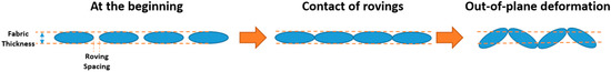 At the initial stage of shearing, the normalized shear force was very low due to the free rotation of rovings inside the tricot pattern, as a curve was shown in Figure 9b. Then, the shear force increased gradually as the spacing between the rovings was vanishing, and the compaction between them start to occur, causing the force to increase rapidly. However, in the next shearing cycles, the fabric became easier to be sheared because of the mechanical conditioning or “softening” of the tricot structure. Having a similar trend of shear force by the next cycles was evidence that the zero pre-tension was achieved. Moreover, the values of the shearing force in the following cycles were lower because of the strained tricot pattern in the first cycle.
