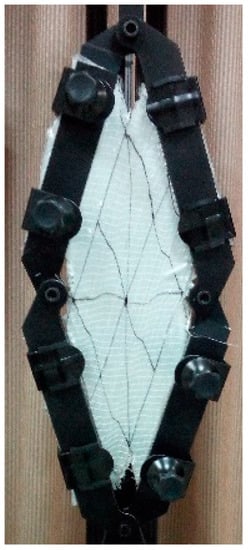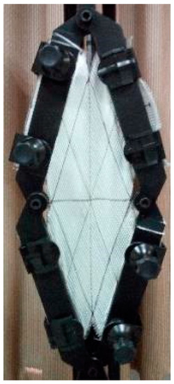 Picture frame (PF) or (trellis shear frame) is a popular apparatus that is essentially adopted to characterize the in-plane shear behavior of textile fabrics [5], especially for dry fabrics and preforms, to produce composites [12,13,14,15,16,17,18,19]. By this simple method of performing testing, pure shear is triggered by the kinematics of the frame [16], which provides reasonably repeatable results if it is carefully implemented, and produces valuable experimental data for analytical and numerical research on two-dimensional (2D) woven fabrics [9], three-dimensional (3D) woven fabrics [12,20], 2D warp-knitted fabrics [15], and 3D spacer knitted fabrics [14]. Moreover, it can be used for unidirectional non-crimp fabrics (UD-NCFs) [16] as well as biaxial non-crimp fabrics (NCFs) [19].