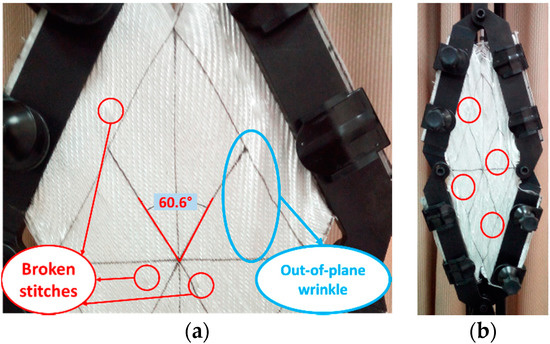 In the curve of the first cycle in Figure 9c, the normalized shear force started to rise gradually up to ~0.5 rad. The rovings became close to each other due to rotating and sliding between rovings inside the stitches. After 0.5 rad, the lateral compaction led to a rapid increase in the shear force and the rovings would be squeezed together within the fabric. This action would not break the stitches in the chains, but it was responsible for the rapid increase in the load resistance. However, in the next cycles, there was just a slight increase in the shear force within the cycle, which means that the stitches were strained by the compressed rovings during the first cycle, and became “mechanically conditioned” or “softer”, which have made the resistance lower in the next cycles. In addition, from visual observations, there were no wrinkles up to 1.05 rad of the shear angle, as shown in Figure 14. Only small local buckling in some rovings occurred at a large deformation angle due to the restrictions of chain stitches during the compaction.