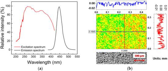 Figure 1b, the variation in the height of the deposition, which shows a peak-to-peak distance of 70 µm with a variance of 5.3 µm, is compatible with the dimensions of the phosphor grains: this suggests that a very good level of deposition quality could be achieved with the adopted technique. That conclusion was further demonstrated by the Environmental Scanning Electron Microscopy (ESEM) (model Quanta 200 from FEI, Hillsboro, OR, USA)) images taken on an untreated sample, here reported at the bottom of