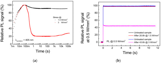 Figure 11b). Interestingly, the PL signal under high level of excitation shows a partial time-dependent recovery beginning after 1.5 h of stress. If we consider that thermally treated samples showed PL recovery during thermal treatment up to 300 °C, this behavior can be related to the thermally induced annealing of the material surrounding the excitation spot.